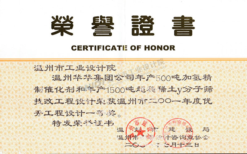 溫州華華集團(tuán)公司年產(chǎn)500噸加氫精制催化劑和年產(chǎn)1500噸超穩(wěn)稀土Y分子篩技改工程設(shè)計(jì) 溫州市2001年度優(yōu)秀工程設(shè)計(jì)一等獎(jiǎng)