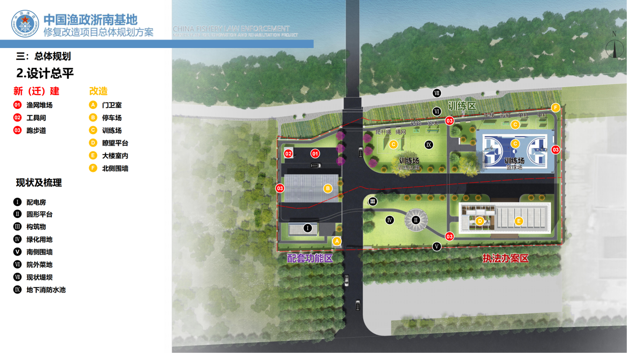 該項目位于溫州海洋經(jīng)濟發(fā)展示范區(qū)(靈昆島),工程建設(shè)用地3230平方米,總建筑面積1642平方米,其中漁政管理用房1559平方米,配電房63平方米,門衛(wèi)室20平方米,總投資約550萬元。項目通過完善基地配套基礎(chǔ)設(shè)施,解決基地年久失修、地基沉降、功能不全等問題,同時改善大院空間布局,滿足基地人員辦公、訓(xùn)練、執(zhí)法辦案、船艇靠泊等需求,提升基地在維護浙南漁場秩序,加強漁船安全管理的綜合保障能力,從而更好地適應(yīng)海洋與漁業(yè)執(zhí)法的新形勢新要求。