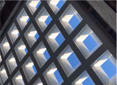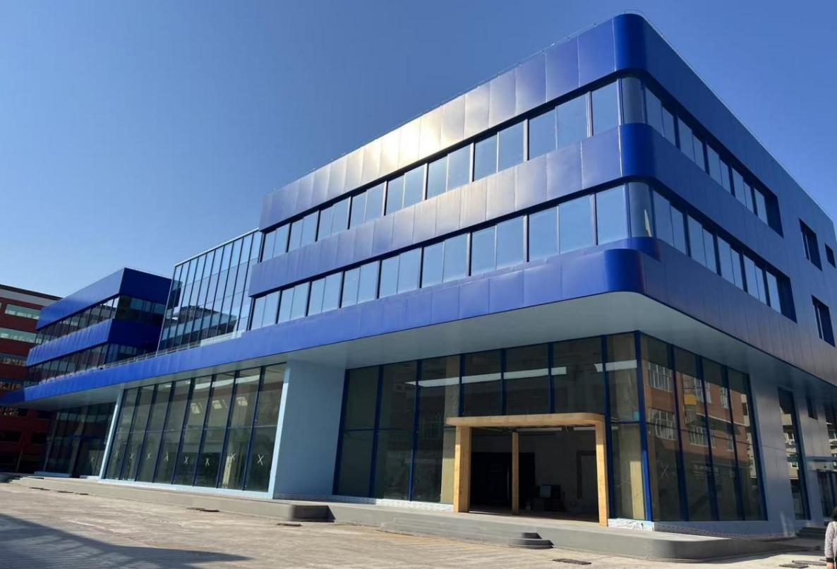 建筑美學(xué):建筑內(nèi)部空間流動活潑,以多維度的層次感與流動性喚醒豐富的空間體驗;建筑外立面采用橫向條形玻璃窗與啞光藍(lán)色鋁板交替構(gòu)成,形成簡潔的現(xiàn)代韻律。同時中庭的空間構(gòu)架在光影交織中勾勒出虛實交錯的幾何敘事。